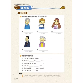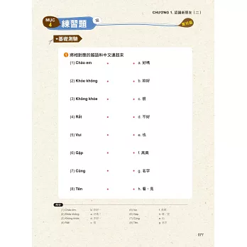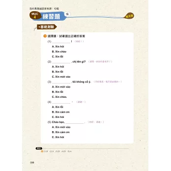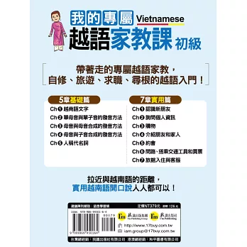 嚴選七大生活單元,每個單元分成聽、說、讀、寫4小節。全書完全符合越語檢定A級程度級考試範圍,讓你除了學會應用在生活上的越語之外,也能夠輕鬆準備越語檢定考。
