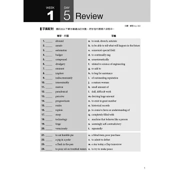 以一篇短文五個單字的規律計畫,每週逐步累積必備的進階字彙。學習過的字彙將在全書的練習、例句和文章中反覆出現,自然而然達到學習成效。