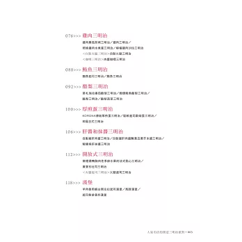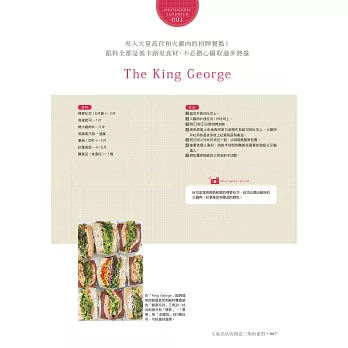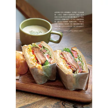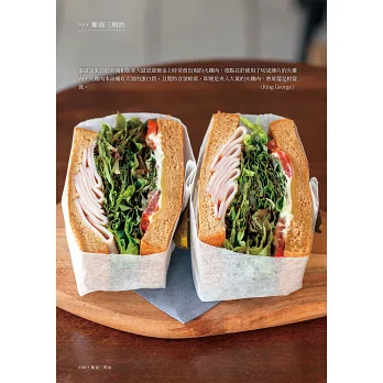 沒有繁雜的步驟、只有讓人充滿愉悅的過程。從各款創意三明治中感受店家滿滿的玩心,活用專業人士構思出的靈活搭配以及小技巧,進而激發出自己的嶄新構想,每個人都能創作出帶有獨特風格的三明治配方,讓這道親民美味為生活增添更多豐富多變的點綴。