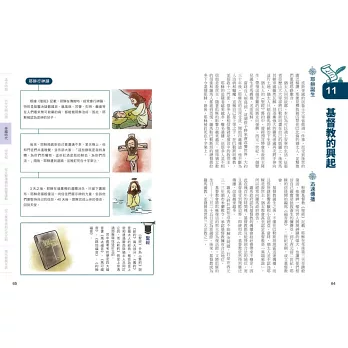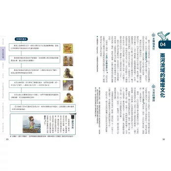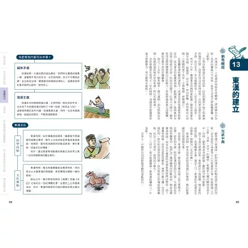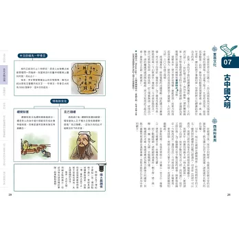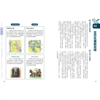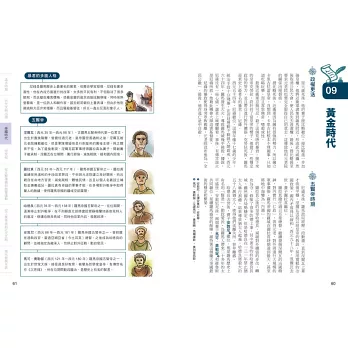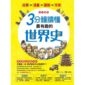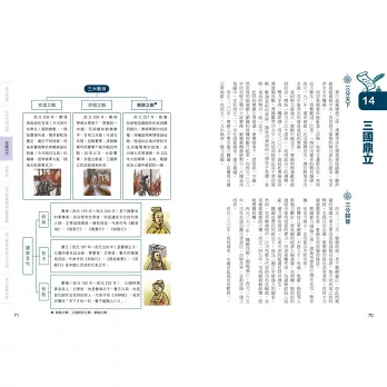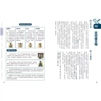 說得更貼切些,本書除了是言簡意賅的歷史參考書,更是一本歷史「筆記書」,不但內容處處是重點,編排設計上也猶如筆記,頁面側邊的單元分色標記、正文外還輔以塊狀Memo或圖表來補充說明重要歷史人物、文化等,不僅便於閱讀,也可省下整理功夫與時間。