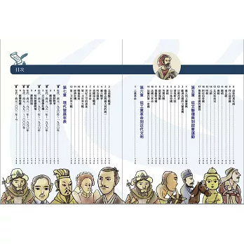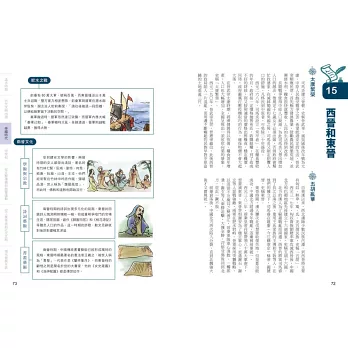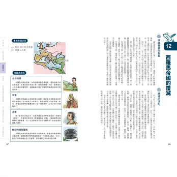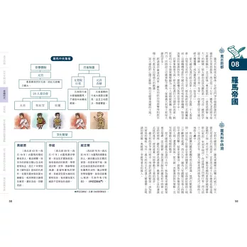 因此,本書在單元規劃上,將中西歷史融合,在帝國時代,可以看到古羅馬帝國的盛衰,同時連貫到秦統一中國、三國鼎立等。也就是說,除了順著時間軸看單一國家的歷史縱向發展,也以帶狀時間橫掃世界主要國家的發展狀況,縱橫兼顧,自然就能建立起完整的世界史觀。