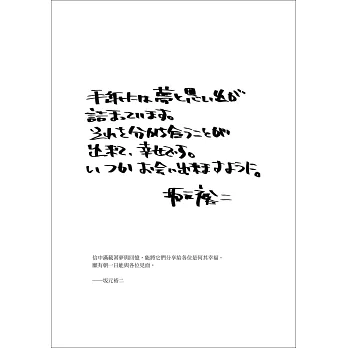 原因我從那時就明白了,因為我知道,往後再也不會遇見這麼喜歡的人;知道未來不論有什麼樣的邂逅、什麼樣的離別,不論我多麼長命百歲,這種事一輩子再也沒有第二次。我就是這麼喜歡你。這份感情如今未曾稍減,也不曾增加,分量一如既往。過去、未來全部存在其中,這是我的初戀。