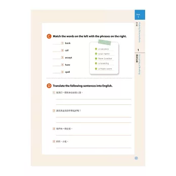 每章節課後備有數種不同題型的測驗,包括問答、填空、造句、選擇、翻譯等,幫助練習所學會話、字彙和應對技巧。