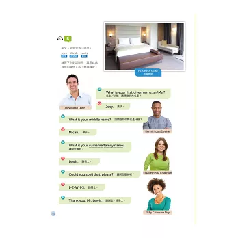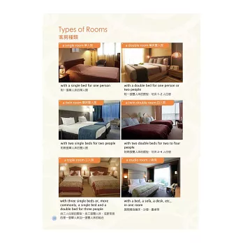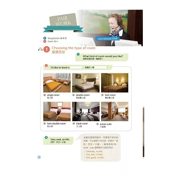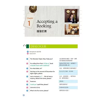 章節區分詳盡,涵蓋主題包含訂房流程、登記住宿、退房流程、結帳、打電話、傳真、交通服務、推薦餐廳、推薦餐點、處理客訴、基本書信撰寫方式等,多元豐富,可習得許多實用的前檯會話技巧。