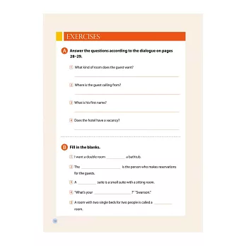 每章節分為Dialogue實況對話、Pair Work 會話練習、Words and Expressions字彙片語、Exercises成果驗收四大部分,依不同情境主題設計對話實例,補充相關字彙,並於課後備有問答、填空、翻譯等練習題型,測驗理解程度及應答能力。