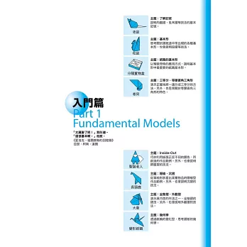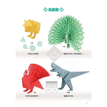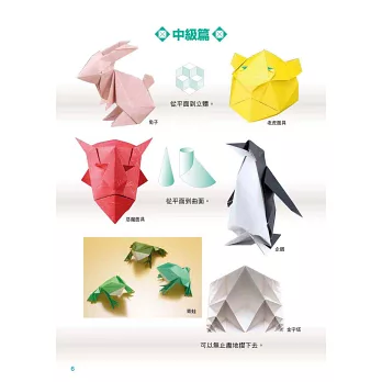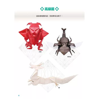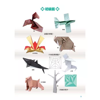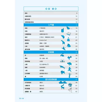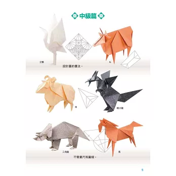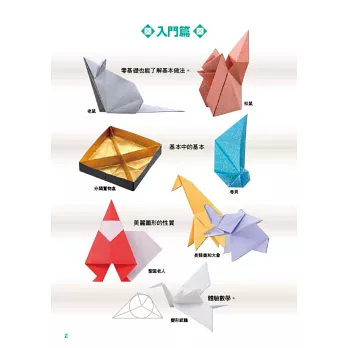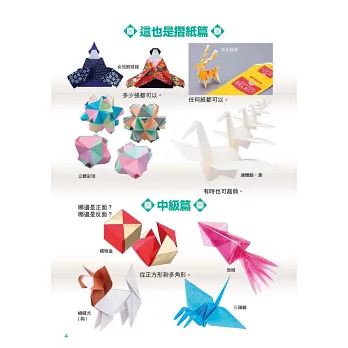 本書分為入門篇、初級篇、這也是摺紙篇、中級篇、高級篇。架構特意設計成讀者只要循序漸進,即使是初學者,也能提升技巧,摺出複雜的作品。