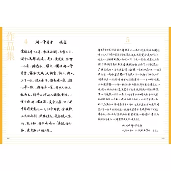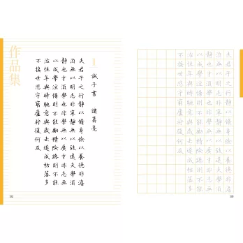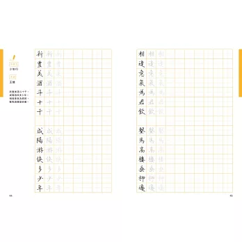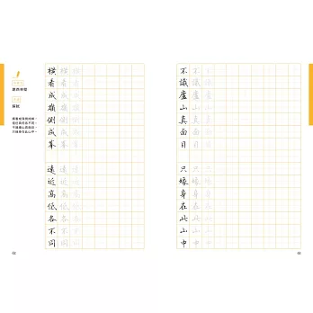 除了40首的七言絕句或律詩外,亦特別規劃了7篇較長的散文或小品,一來可以欣賞作者書寫長篇大作時的「行氣」,再者其中幾篇也安排了練習的章節,讀者也可以透過臨摹完成一篇美字。