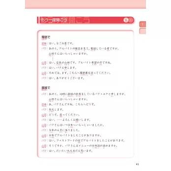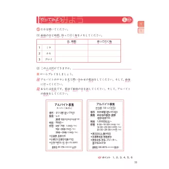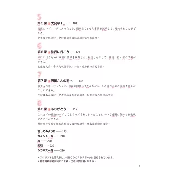 有別於直接進入文法句型或文章的教科書,是以「狀況插圖」提示會話進行的狀況,嘗試用已知的日語表達。讓學習者思考符合狀況當下的會話流程,提升日語的運用能力!