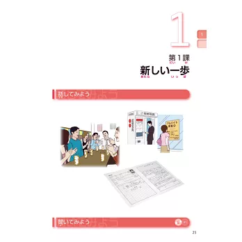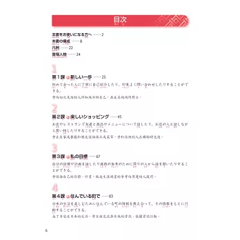 採用「購物」、「生活」、「旅行」、「拜訪」……等貼近生活的內容,並設立明確的課程目標。每課皆設定一個主題,再由3個相關小主題的「說說看」、「聽聽看」、「挑戰!」、「說說看A/B」、「做做看」依序深入練習。透過相似情境把握既有的語言知識,進而吸收新的文法與詞彙。
