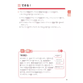 每課學習完3個小主題後,可藉「能做到!」單元的綜合活動實際演練,並從「說聽讀寫」的故事與問題中練習完整地敘述,意識說話的脈絡。可培養學習者的段落構成力,立即驗收理解程度,達到學以致用。