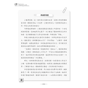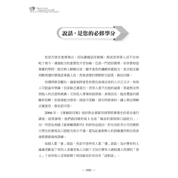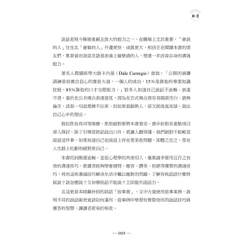 這是一本暗藏妙招的說話「故事書」,文中多以故事案例作為主體,說明不同的說話術究竟該如何運用,我們絕不能錯過這本好書,有實際效用的說話技巧與應答的智慧,早知道,早好;早學會,早好,因為我們誰都無法預測說對話,能為自己帶來何等利益,而說錯話又會產生多大的損失。