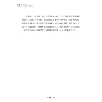 很多人知道自己說話不流暢,語意時常表達不清,便羞於在公共場合表達意見,因為多數人在正式場合都很容易腦袋空白、語無倫次,或是一句話都擠不出來,但如果是跟熟人,卻又能侃侃而談,說出自己心中的想法。假如你也有同等困擾,那這本書你買了絕對不會後悔,對溝通各重點深入探討,引導你改善溝通,除了說出口外,更讓人聽得懂,在各場合都能自然地說出適當的話。