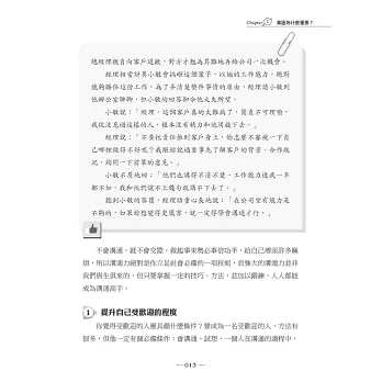 溝通,代表著你的思考能力,對環境的觀察、對人性的掌握,是否能清晰地理解對方語意並做出回應。但懂得察言觀色,適時地的把意見和想法表達出來的人,又有多少呢?有些人很有學識,卻因為缺乏「溝通力」,而看不出他的表現,得不到別人的注意和賞識;有些人專業能力很強、工作出色,表達能力卻很差,言談不流暢且混亂,就算腦中飽含很好的經驗和見解,他人卻無法理解。