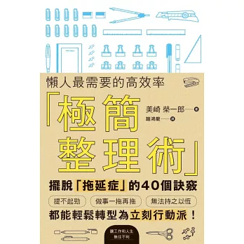 被譽為「超級上班族」的暢銷作家美崎榮一郎,將會告訴你如何結合科技設備與便利服務,找出自己的需求,建立一套個人專屬的收納機制,不必勉強自己取捨的懶人式整理術!