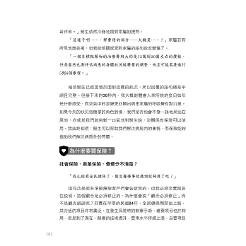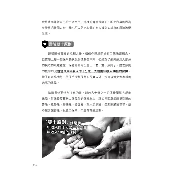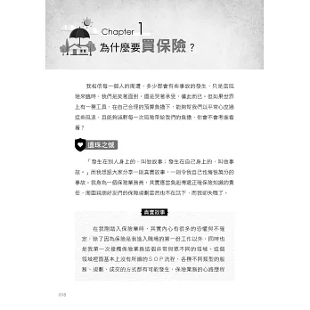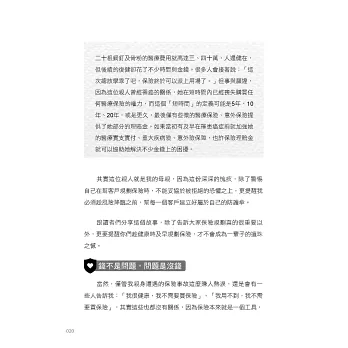 「錢不是問題,問題是沒錢」,如果我們身上有雄厚的資產、背後有龐大的醫療資源、上頭有可靠的父母及人脈,沒買保險似乎也問題不大,因為風險並不構成威脅。但是,如果沒有上述這些資源,保險這個風險規避的工具,值得我們好好思考以及運用。買保險時,比起什麼都買,不如仔細檢視自己的需求與財務分配。書中以圖表帶你先清楚認識壽險、意外險、醫療險、重大疾病險、長照險,並分析預算與規畫,讓每一分花在保險的錢都不浪費。