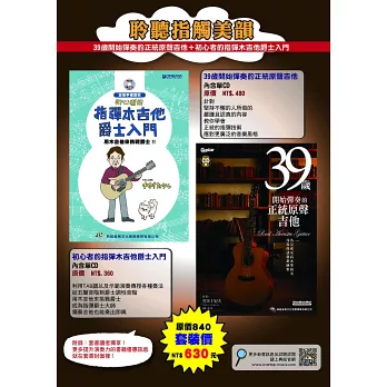 至於在即興奏法上,「該怎樣才能彈出爵士韻味!」乙事,會從五聲音階到爵士調性音階,向各位讀者做簡單明瞭的解說。當然,除了木吉他以外,電吉他以及六弦烏克麗麗也能夠援例引用。