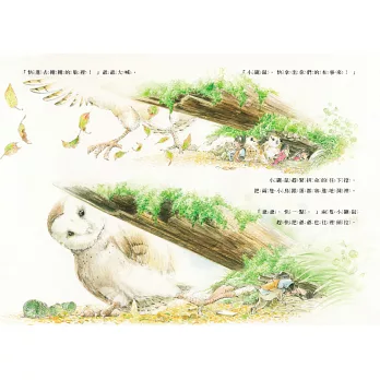 小鼴鼠跟爺爺一起出門遠足。在森林裡走著走著,卻遇見了一陣濃霧,迷霧中用心傾聽,發現了一個鳥巢裡有兩隻小鳥跟一個蛋,正當他們開心的跟小鳥玩耍時,聽到迷霧中有猛禽飛來的聲音,一隻貓頭鷹突然現身,準備捕捉在鳥巢裡的幼鳥,三隻小鼴鼠該怎麼做?他們能順利幫助幼鳥們脫離險境嗎?