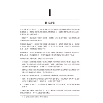 本書內容包括學習如何找到題目中的提示與隱藏的細節,如何將問題拆解成可以處理的子問題,遇到難題時的脫困技巧,(重新)學習計算機核心概念,並且練習189個面試問題以及解決方案。