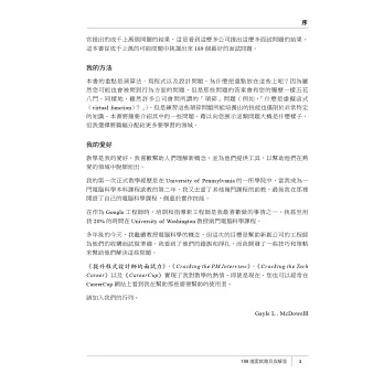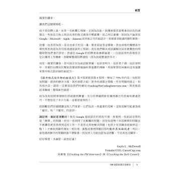 這本書將幫助你準備這個過程,告訴你必須知道的事情以達成最佳表現。我訓練與面試過數百個軟體工程師,然後有了這本書。