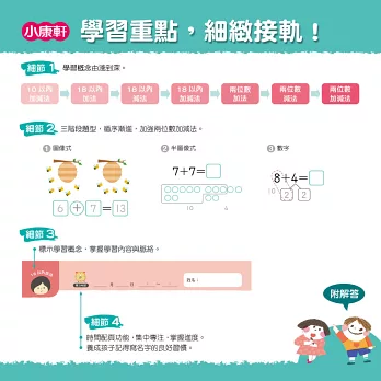 (1)先由10以內加減法熱身,再漸進學習18以內和兩位數的加減法。