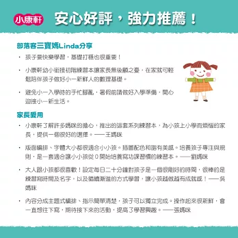 版面編排、字體大小都很適合學齡孩童。插圖配色和諧有美感,一開始就先寫姓名的練習很不錯!特別採用左右翻閱的方式小孩寫起來不會浮浮卡卡的,是一套從0開始培養寫功課習慣的練習本。