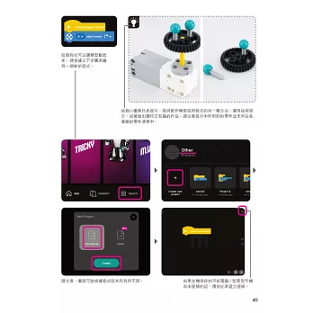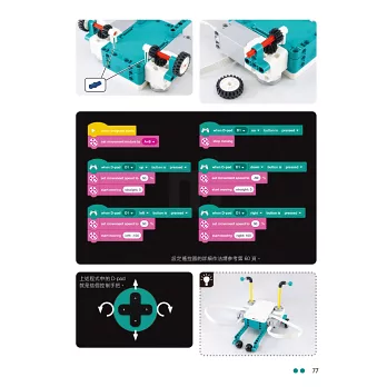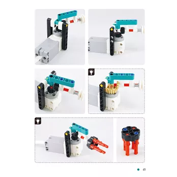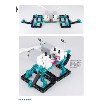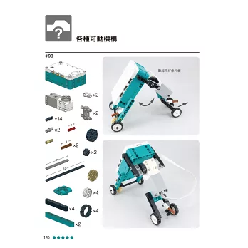 你可以學到如何操作馬達與感測器、做出由馬達來行走或驅動的機器人,以及可以把東西抬起來、開門、畫畫甚至發射砲彈的實用工具,當然還有許多創意小物囉!所有的作品都應用了一些簡單的機械原理,你可將其用於更多的創作之中。你會獲得許多靈感來組合各種機構,或用於改在你原有的玩具、小車、遊戲,都拿出來吧!
