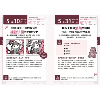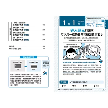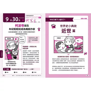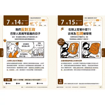 介紹366個世界著名的歷史事件,一天一頁,只要每天花三分鐘,就能掌握歷史上的今天,發生了哪些影響世界的人事物。全書透過豐富精采的單格漫畫、猜謎問答、看圖找不同……等有趣互動,幫助孩子學習各種基礎知識。