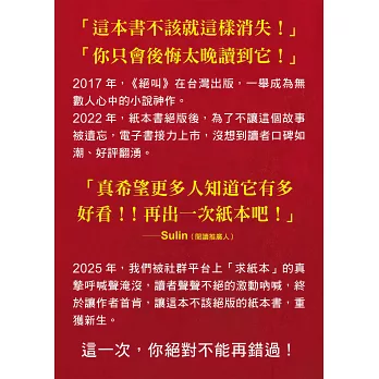 2025年,我們被社群平台上「求紙本」的真摯呼喊聲淹沒,讀者聲聲不絕的激動吶喊,終於讓作者首肯,讓這本不該絕版的紙本書,重獲新生。