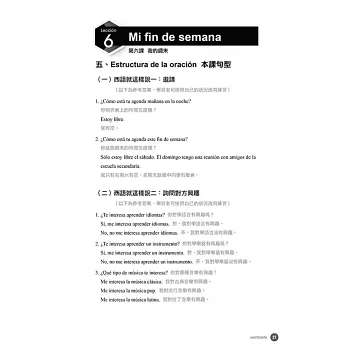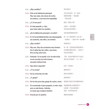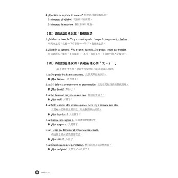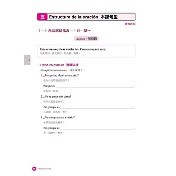 為了達到輕鬆、直覺學習西語的目的,作者也將書內的解說文字,減至最低,並以大量的實戰演練代替。力求不被文法綑綁思緒,將注意力放在如何用西語表達上,希望讓你達到真正像母語人士般運用自如的境界。例: