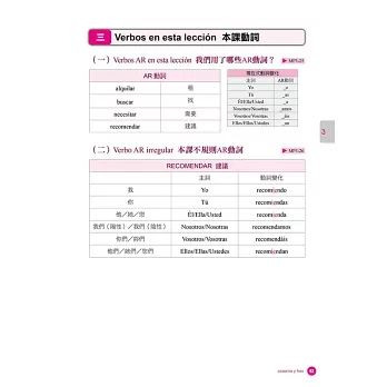 更貼心的是,三組規則動詞都列出了詞尾的現在式動詞變化,做練習時,若忘記6大人稱的現在式變化,可以馬上查閱。