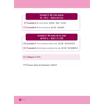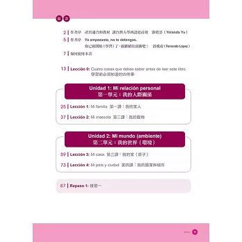 於是除了8大正課的學習單元外,又撰寫了2大複習單元。將前4課的學習內容一次整合,設計6大題、不同面向的西語練習,讀者除了能測驗自己的吸收程度,也能從中學習將外語融會貫通、運用的能力。