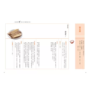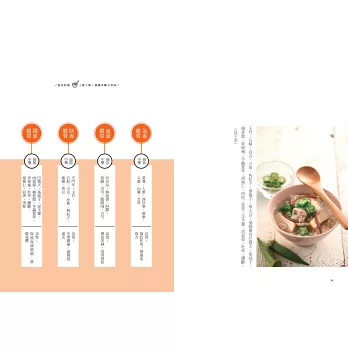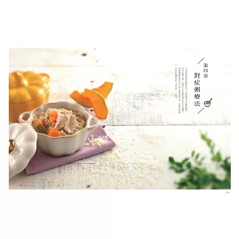 針對呼吸系統、消化、心血管、泌尿系統、內分泌新陳代謝系統、婦科疾病、兒科雜症、皮膚系統、文明病,提供建議藥膳,可以針對自己身體需求選擇所需的藥膳粥療。