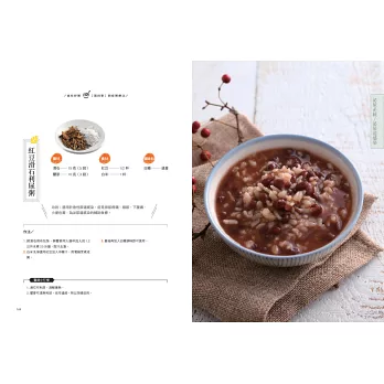 歐美最流行的超級榖物也收錄在本書中。煮粥時一般使用的是白米,但如果在白米中搭配少量超穀物,對健康有加承的效果,一般是少量添加,如白米:穀物=4或5:1。因為這些超級榖物擁有更豐富的營養素和抗氧化成分,可提高人體的免疫力。但並不適合完全取代白米,因為這些穀物的蛋白質含量高於其他穀物,會造成消化能力差的人較大的負擔。所以,正確地吃,不但能調整身體不適,還能強化健康機能!