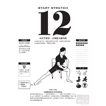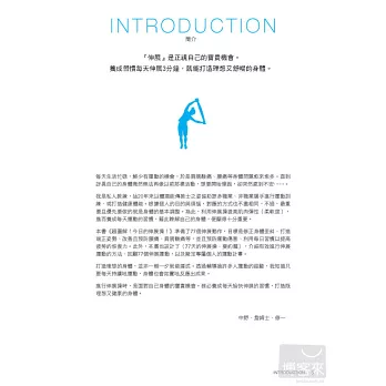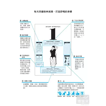 針對現代人的六大身體問題逐一攻破:長期打電腦的『肩膀痠痛』、久坐引起的『腰痛』、因肌肉僵硬而無法『端正姿勢』、『慢跑』所導致的運動傷害、『高爾夫球』所造成的體型歪斜、預防肌肉萎縮的『抗老化』,進而規畫出三階段的《入門伸展》、《基本伸展》及《進階伸展》,總共77個伸展動作,11週後讓身體煥然一新。