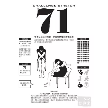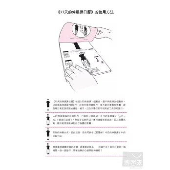 不僅是單純做伸展,還能增長知識!《77天的伸展操日曆》提供了每日的「健康小常識」,你知道肌肉是從哪裡開始老化的嗎?運動也只要做到八成即可?腰痛時該怎麼舒緩?水分的補給時機為何?消除腳部浮腫的小撇步?燃燒脂肪的好物是?各種五花八門卻又切重生活核心的健康問題,是重視自己身體的讀者最佳選擇。