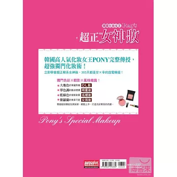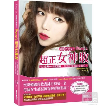 命運之神找上她是2008年的事。當時她首次在個人部落格經營「Pony的彩妝講座」,容易上手又效果驚人的彩妝影片教學立刻讓她的部落格人氣大增。直到現在,她獨家的彩妝畫法和各式各樣美妝情報,仍讓上門拜訪的訪客數持續不斷地增加。Pony的彩妝講座不僅在網路上大受歡迎,在真實世界裡的詢問度也居高不下,憑藉著這股熱度,她在2011年出版的《韓國人氣化妝女王PONY’S韓系搶眼妝》,甫上市就立刻攻占美妝類書排行榜第一名。現在,她的第二本新書《韓國化妝女王Pony’s超正女神妝》上市囉!整本書收錄了Pony獨家的進階彩妝講座和彩妝技巧,並且搭配了滿滿的示範圖片,Pony再一次雙手奉上這本傾注全力、無愧於心的作品《韓國化妝女王Pony’s超正女神妝》,希望各位讀者都能透過本書,找到原本屬於自己的美麗,也希望手上拿著本書的每一個人,之後的每分每秒都變得更耀眼奪目!