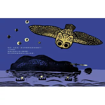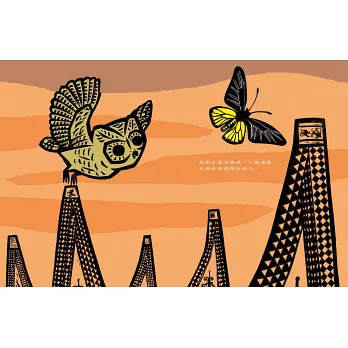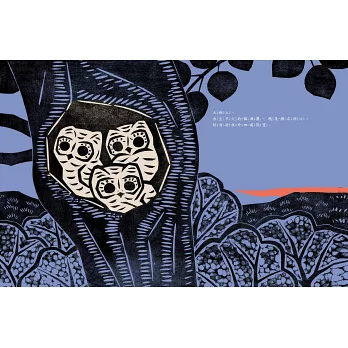 全書以木刻版畫方式創作,透過黑色油墨線條呈現出各個生物粗獷卻俐落的外型,加上簡單的顏色對比出單純生命的樣貌紋理,是版畫家何華仁獻給他最喜歡的猛禽和這片土地最美的禮物!