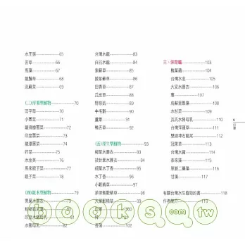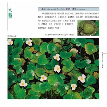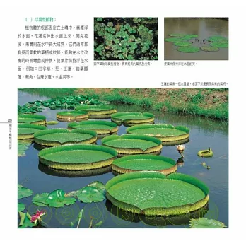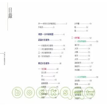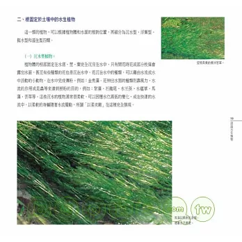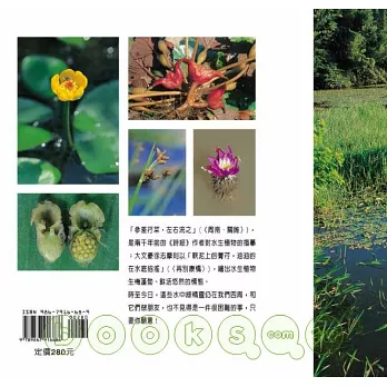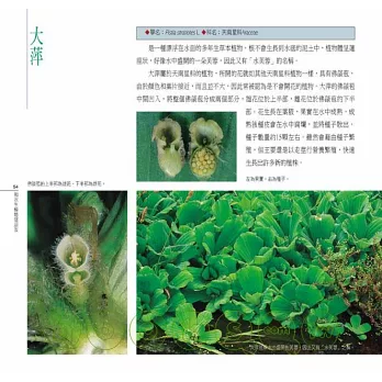 同時,基於自然與人文交融的理念,本書在撰寫時,刻意讓植物更貼近人們的生活、與人對話,於是在內容上,嘗試從水生植物與人類生活的關係來入手,分為「生活篇」、「自然篇」以及「保育篇」三類。每篇除為這些綠精靈朋友驗明正身(分類)、戶口普查 (分布)外,也分析它們的「物際關係」,以理解從傳統到現代,水生植物與人類生活、文化的關聯。