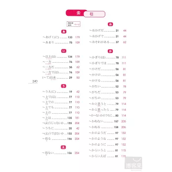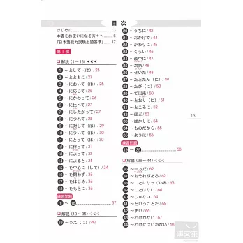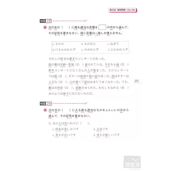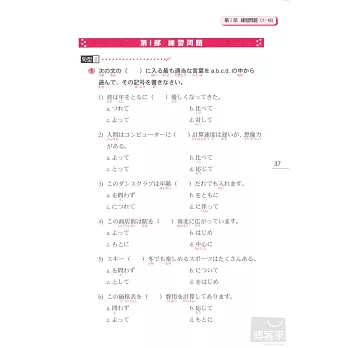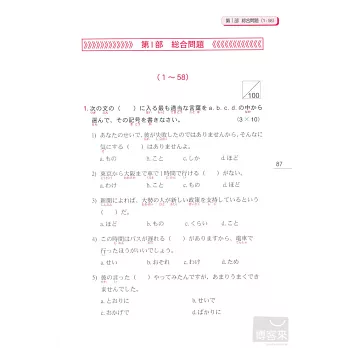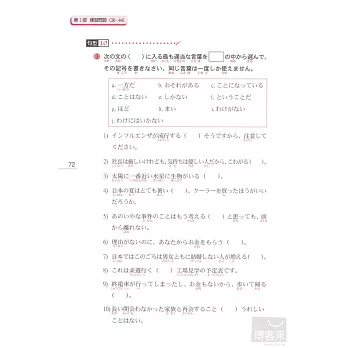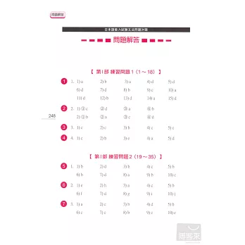 各部分學完後直接進入單元練習題、整本學完後則有綜合練習題,立刻測試你是不是真的懂了。練習題題目都是針對最困擾考生的接續、助詞等部分反覆練習,實際體驗自己的實力正在不斷成長吧!(答案附在本書最後)