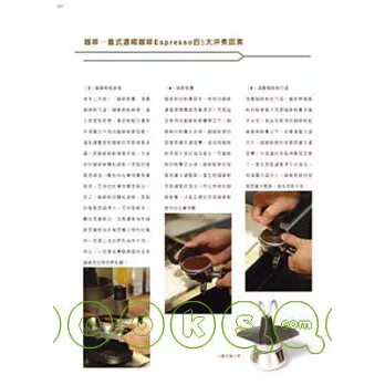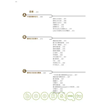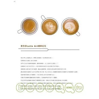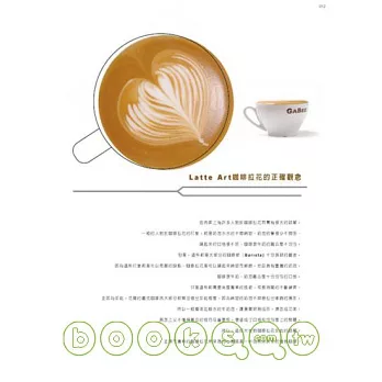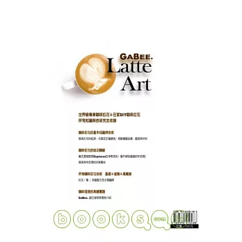 「Latte Art咖啡拉花--- Espresso與牛奶的完美邂逅」收錄了本書作者---林東源,也是台灣咖啡師大賽冠軍、自創出:蝴蝶、海螺、蘋果…等許多獨特拉花圖案,被譽為台灣創意咖啡及咖啡拉花達人,多年來關於咖啡及拉花所有的知識與經驗。分為三個部分:1. 咖啡拉花的基本知識與技術:咖啡拉花的起源、分類及正確觀念/ 相關機器設備、器具與材料。2. 咖啡拉花的成功關鍵:義式濃縮咖啡Espresso的沖煮技術/ 製作綿密細緻的牛奶泡/ 咖啡與牛奶泡的完美融合。3. 所有咖啡拉花技術 基礎&進階&高難度:拉花?種 / 詳細配方及步驟圖解。4. 咖啡理想的具體實踐GaBee.。對於喜愛咖啡拉花的讀者,或是開業經營咖啡館的朋友,都可從本書中得到毫不藏私、最新,也最實用的咖啡拉花技巧。