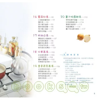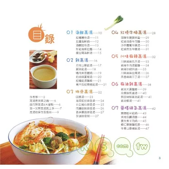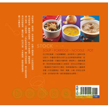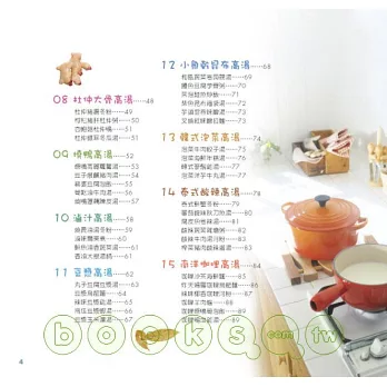 ◎書中的高湯均由作者精心設計,有別於常見的單純大骨高湯、雞骨高湯,這20種高湯多半具有可食用的湯料,不僅可直接運用湯汁做為火鍋湯底,更可湯料並用,變身為各種營養豐富的溫暖佳餚。