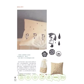 作者善於將居家、雜貨、創意與遊戲等生活元素有趣地結合在一起,只要是輪廓簡單、線條清晰的圖案,都能成為橡皮圖章創作的雕刻題材。本書除了示範轉印圖案與橡皮擦印章的雕刻技巧,她更分享許多令人驚喜的雜貨創作手法。諸如餐桌上的刀叉、甜甜圈、花園裡的花朵、瓢蟲、可愛俏皮的卡通人物、幾何形狀的水滴、圓圈,甚至是臉上戴著的膠框眼鏡,這些圖案無論是出現在餐桌角落或衣著配件上,都能成為點綴生活的獨特趣味。