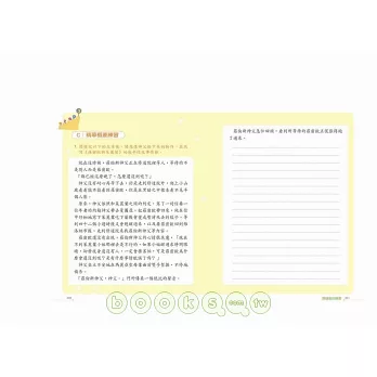 透過「作品理解」、「精華概要練習」、「自我評量」的題目引導,培養孩子的思考能力和寫作能力,加深孩子對文學名著的印象,並嘗試創作出屬於自己的作品。