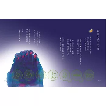 在他的花園裡,最會寫詩的是花瓣,每年春天,他慷慨提供白紙,打開窗戶,邀詩入帘;在他的花園裡,春天有個貪婪的鼻子,讓蜜蜂馱著到處尋花問柳;夏夜則是迷戀曇花姑娘的黑衣怪客。每到四月,花園裡的住戶看到螢火蟲屁股點燈,都希望他能幫點什麼忙,他卻一心只要去挖「夜」這漆黑煤礦;群蛙鼓譟,對著荷花念了一晚又一晚的愛戀經,讓人以為又是什麼選舉造勢,園長於是派流星去轟炸,警告他們別再鬧了;而月亮是個嘴饞的鄰家孩子,他想減肥,又不願放棄土星外圍的甜甜圈,結果總是一會兒瘦一會兒胖……。
