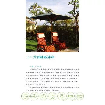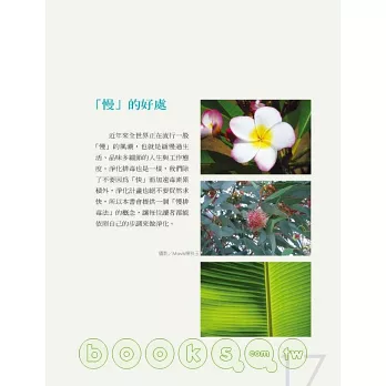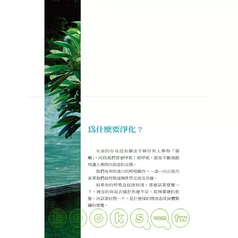 這真的是一本好書,好在你不需要花費太多心思,就能找到許多淨化心靈與肉體的好方法,好在你隨意翻閱,就能找到一些切合自己問題的改善之道……好吧,說到這裡,我又要來翻翻這本書了,也許就在下一分鐘,我將感受到心靈更加澄淨的快活!