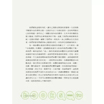 這本書,其實不需要從頭看到尾,而是可以隨意的翻出一個章節,你就可以找到一些讓自己變得更好、更舒服的靈感與動力!