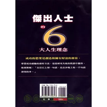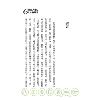 本書正是出於這個方面的考慮─探討傑出人士一生應該具有的人生理念,闡明理念對成功的重要性。書中所列舉的六大人生理念都是從傑出人士的成功經驗中提煉出來的。傑出人士正是因為具有這些理念,才使得他們無論是在做人或做事都取得了非凡的成就。