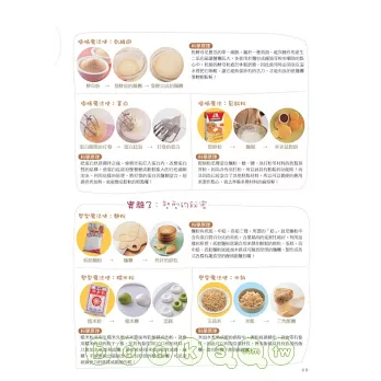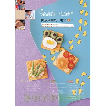 食譜中使用了許多鬆餅粉和吐司來製作點心,這是因為鬆餅粉可以變化的點心種類很廣泛,且製作方式簡單又容易,如果不想要準備繁雜的工具和材料,那麼鬆餅粉就是最佳的選擇,例如黑糖小饅頭、骨頭餅乾和米老鼠鬆餅。吐司也是日常生活中隨時可以取得的好食材,只要把吐司看做是一張畫紙,聰明的爸媽們一定也可以變出有趣又好吃的點心,例如書中的果醬三明治變成了傳達愛意的吐司卡片;裹上汽水麵糊油炸,就變成了好吃的甜甜圈(小甜甜聖誕花圈);更簡單的是將吐司對角切四片,撒上起司絲再烘烤,立刻成了日本的富士山。而冷凍酥皮是可以放置在冷凍庫保存的另一種方便材料,想要來一份簡單的下午茶,就拿出酥皮來加以變化吧!例如好吃又好做的葡萄乳酪捲心酥和酥皮沙拉船。