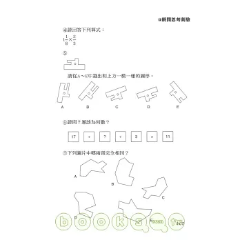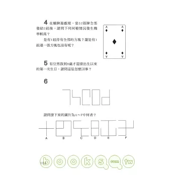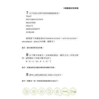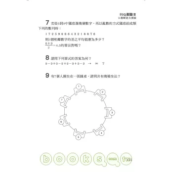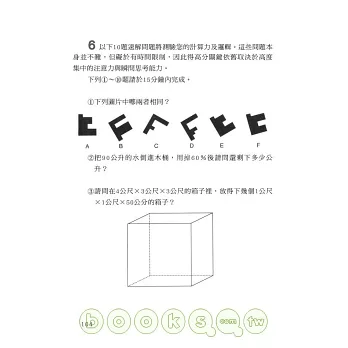 本書作者飛利浦.卡特&肯尼.羅素為英國知名智力測驗作者,將全書分為「創造力」「記憶力」「思考靈活度」「瞬間思考」「智力測驗」五大項,除了益智問題集外更附上詳盡解說與評分表,讓您在遊戲中一步步增強頭腦靈活度、抑制腦部老化,更加了解自己的潛能何在!