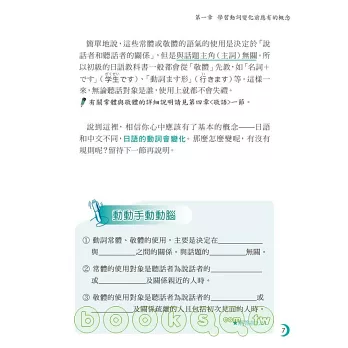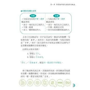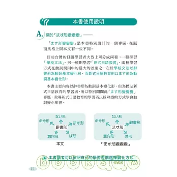 目前台灣的日語學習者分成學習「學校文法」與「新式日語教育」兩大主流,兩種學習法的動詞規則也略有差別:學校文法以辭書形為動詞基本變化形,新式日語教育則以��形為動詞基本變化形。因此本書同時收錄兩種動詞變化規則,希望能讓更多日語初級學習者建立對動詞使用的基本概念與學會動詞變化,是一本適合所有日語初學者的最佳學習書。